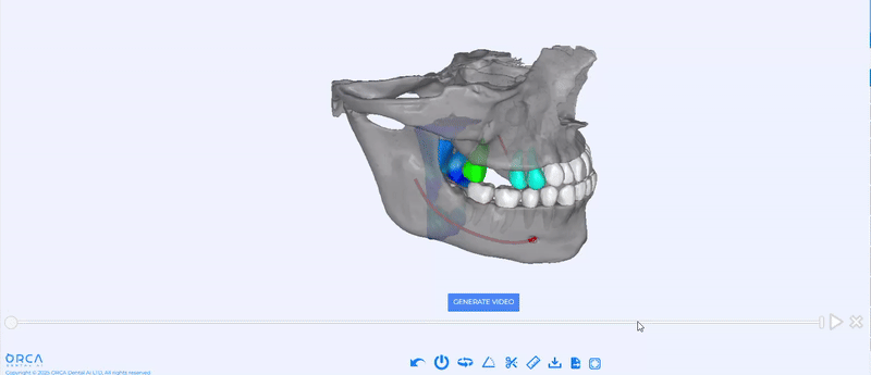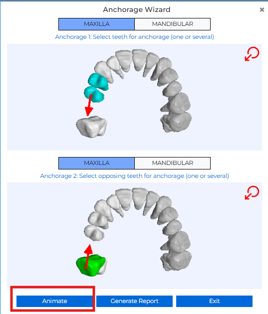 Simply open the Ortho “Calculate Anchorage” tool in the 3D Viewer to launch the Anchorage Wizard, select your anchorage and opposing teeth, set the movement vector, and click Generate Report to download it instantly. You can then click Animate to visualize the planned tooth movement.