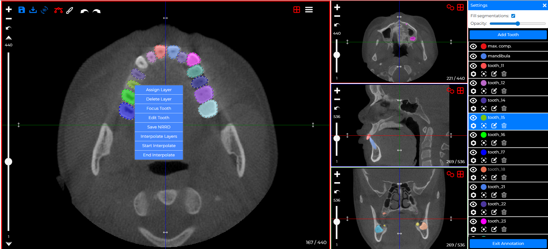For an existing tooth, open the annotation menu, select Interpolate, define the start and end layers, and click End Interpolate to automatically generate all layers in between.