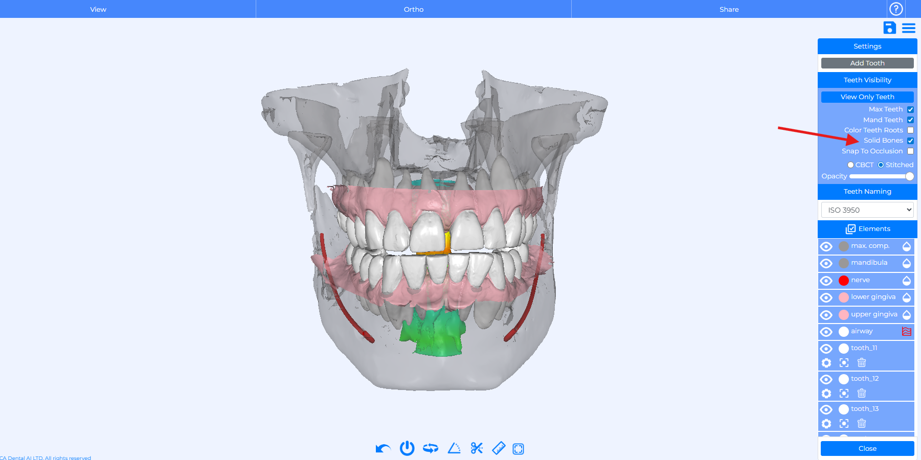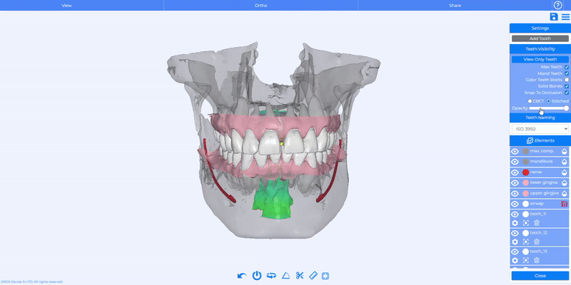 You now have full control over visibility in the Tooth Panel: adjust the opacity of gingiva, bone, airway, and nerve with dedicated sliders.